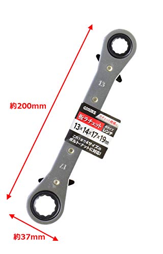 ボルトやナットに対応するサイズはそれぞれ、13・14・17・19です。ボルトを締め付けたり緩めたりできるので、工業機械の点検や補修作業にも役立てられます。とてもリーズナブルなお値段で購入出来るラチェットレンチで、耐久性の高い炭素鋼・S45Cを材料に作られているので劣化もしづらいです。