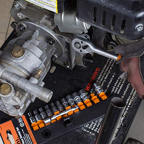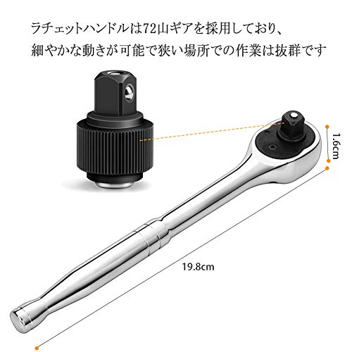 サビにも強い高品質なクロムバナジウム鋼を素材に作られているラチェットレンジで、クイックリリースのデザインなのでソケットの脱着もボタンをポチッと押すだけで簡単にできます。72山ギアを採用しているため、細やかな動きもできて狭い場所のボルトやナットのネジ締め・緩め作業もしやすいです。ソケットサイズは8・10・12・13・14・15・17・19mmの全8種類がありますので、ボルトに適したサイズから選んで使用できます。