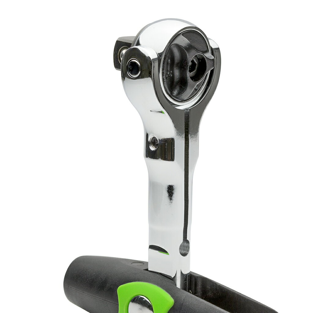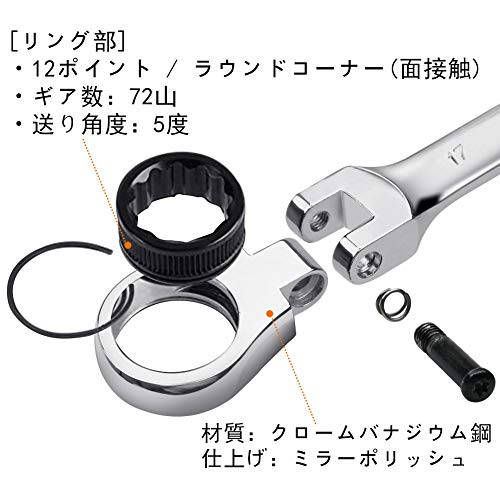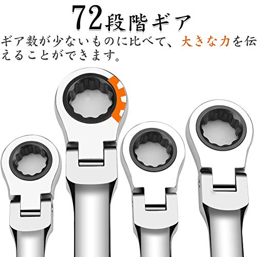 高品質なクロムバナジウム鋼を熱処理した素材で作られている商品で、耐摩耗性に優れていて錆びにくいという特徴もあります。0°から180°までの首振りが可能なフレックスヘッドを採用しているため、障害物を避けながらネジの締め・緩め作業ができます。細かい動きもできるので狭いスペースのネジ締めも行えます。72段階ギアを採用しているので、ギア数が少ないラチェットレンチと比較して大きな力を伝えられる特徴もあります。設備のメンテナンスやご自宅でのDIYや建築作業など幅広い使い方ができます。