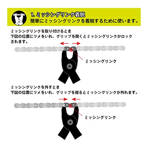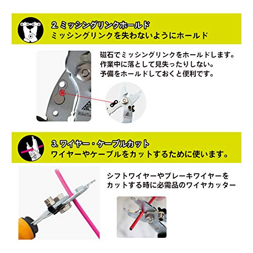 ミッシングリンク着脱・ミッシングリンクホールド・ワイヤーカット・エンドキャップ締め付け・カット時の断面の穴を広げるなどの5種類の用途で役立つ便利な機能がセットとなっているメンテナンス工具です。ロードバイクやマウンテンバイクやクロスバイクやママチャリなど、幅広い自転車の種類に対応して役立てられる工具です。サイズも小さめなので、サイクリング時の万が一の故障に備えていつでも携帯しておくのもおすすめな商品です。