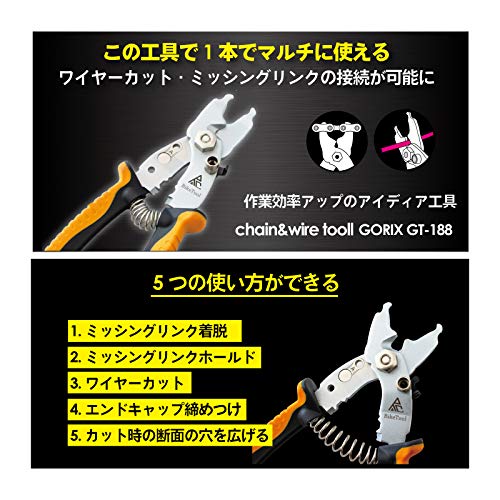 自転車用品の人気ブランド・ゴリックスより販売されている5機能マルチ・メンテナンスツールは、全5種類の機能が付いていて自転車整備初心者にも使いやすいです。実際に購入した方のレビューでもワイヤーカッター付きで道具箱の節約に良いという投稿や、ミッシング取り付け・取り外し機能・ワイヤーカッター機能もついていてとても使いやすいというクチコミも投稿されています。