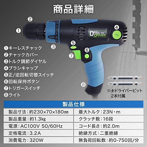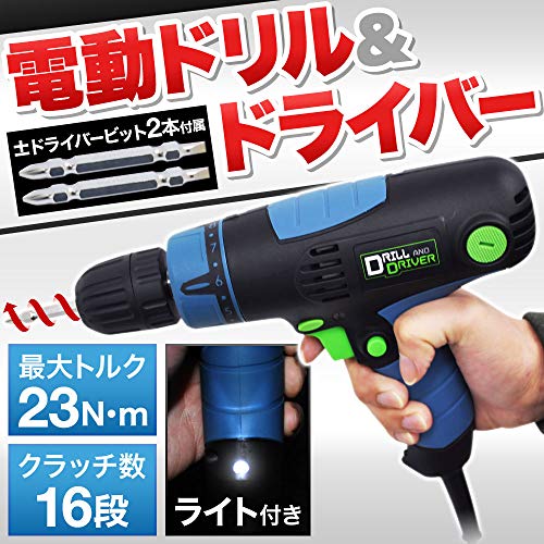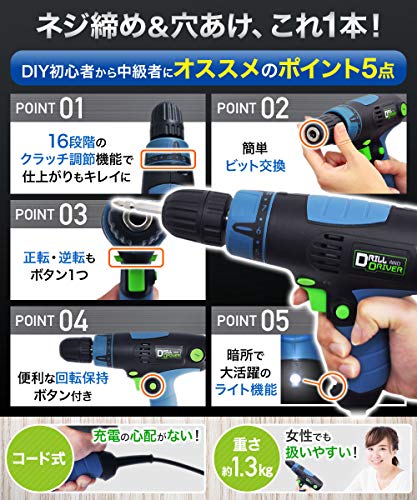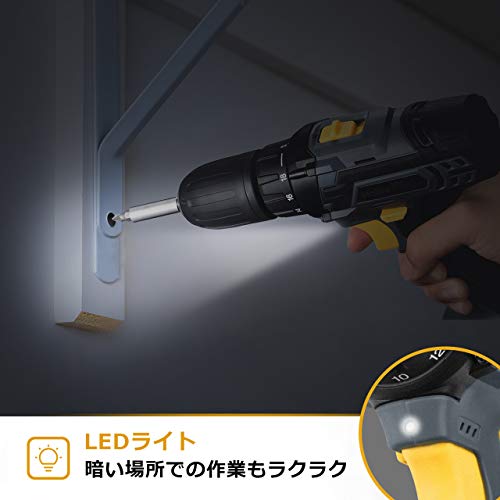 ベルソスの電動ドリルはドライバーやドリルが付属しない分安い製品です。付属品の有り無しは選び方のひとつになってきます。用途が決まっている場合は全て揃えるよりも自分が欲しい物だけを買うほうがコスパが良くお得です。この電動ドリルは暗いところでも作業出来るようにドリル回転時にライトが付くようになっています。暗いところでも正確な作業をすることが出来る商品です。