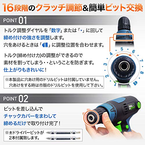 GALEXのコードレス電動ドリルは他の製品と比較すると非常にコンパクトです。トルクや回転方向などが大きなボタンで簡単に変更することが出来ます。またこの製品には複数のドリルが付属していて開けたい穴の大きさに合わせてドリルを変えることが可能です。電動ドリルを買うと付属しているドリルは大体1つのことが多いので、最初から複数のドリルが入っているのはコスパが良い商品になります。