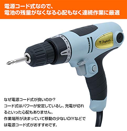 コード式電動ドリルは電源にケーブルを接続して使います。コード式ではバッテリーが本体にないのでコードレス電動ドリルよりも重量が少なくコンパクトな商品が多いです。また、コードレス電動ドリルと比較してパワーが強いものが多く、硬い素材に対しても使うことが出来ます。しかしあまりにも硬いと電動ドリルが壊れてしまうので注意しましょう。