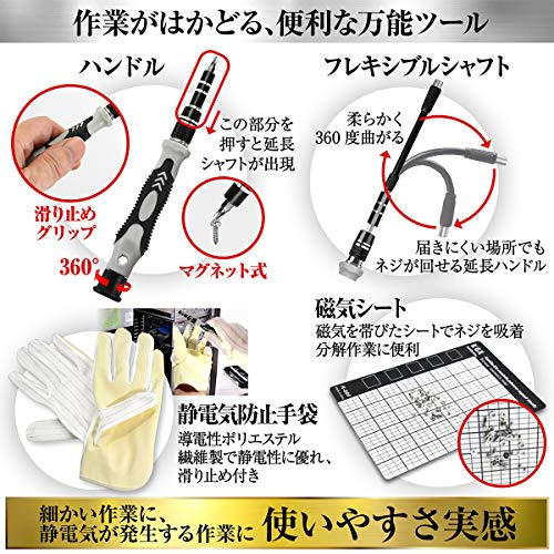 大型家電の修理から、小さなネジが多いデジタルカメラの整備など、使うシーンはさまざまです。また、先端はフレキシブルシャフトになっていて、曲げることが出来るので、手が届きにくいところでも作業が出来ます。