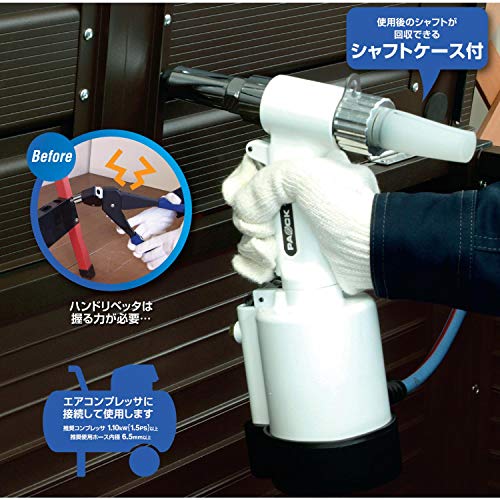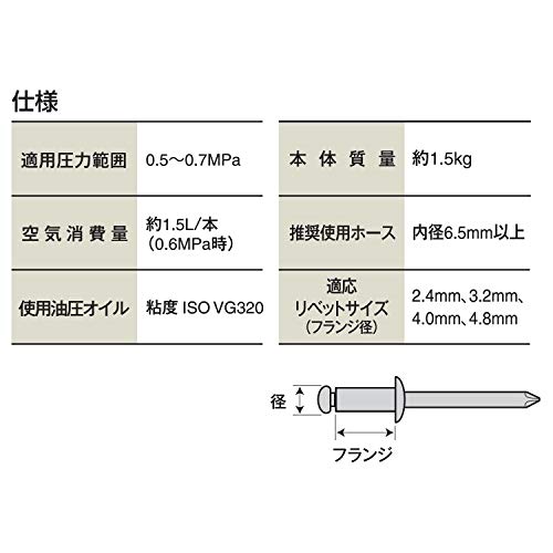 こちらの商品の使用できるリベットサイズは2.4、3.2、4.0、4.8です。重さは1.5kgで、空気消費量は1本1.5L。リベットのシャフトが回収できるケースもあるのでその点も安心して使えるのではないでしょうか。お家のエアコンプレッサーに接続してご利用ください。エアタイプなので、こちらもそこまで力を入れずに作業できます。
