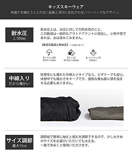 耐水圧が2000mmある生地を採用していて、生地の表面には撥水加工も施されているために、しっかりと水を弾いて、水分の浸透も防ぎながら着用出来るジュニア用上下セットです。さらに暖かい中綿も充填されているので、真冬のゲレンデでスノーボードを楽しむ時にも体を冷やさないように着られます。