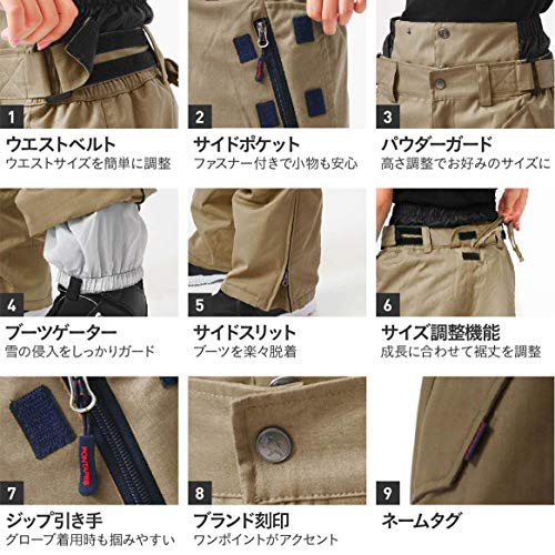 ジャケットには雪の侵入を防ぐためのパウダーガードがついており、パンツにはウエストを調整できるウエストベルトが付属。カラーのバリエーションもあるので、好きな色から選んで使えます。