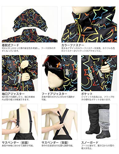 さらに表記サイズよりも-15cm縮めて使えるサイズ調整用アジャスターも付属。ジャケットのフードは取り外し可能で、パンツには滑走中にもずれにくいサスペンダーが付いています。