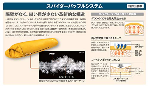 非常に画期的な最新モデルのダウンシュラフです。一般的にダウンは隔壁がないと偏り、保温できる場所とできない場所が生まれてしまうことから、ダウンジャケットでも寝袋でも隔壁がきちんとあり、隔壁部分が凸凹とした特徴的な模様になってます。本製品は隔壁をすべて取り払い、縫い目を極力なくすることで非常に保温性が高くなっています。