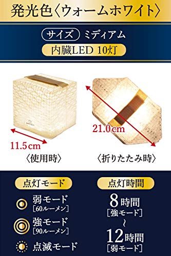 | 仕様 | 連続点灯時間:ハイパワーモード/10時間(4時間)、ノーマルモード/25時間(10時間)、常夜灯モード/80時間(32時間)、ゆらぎモード/40時間(16時間)※()内はニッケル水素充電池の数値です。明るさ:ハイパワーモード/200lm(ルーメン)(白色LED)、ノーマルモード/100lm(ルーメン)(暖色LED)、常夜灯/20lm(ルーメン)(暖色LED)、ゆらぎモード/可変(暖色LED) |