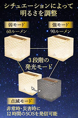 優しい暖色系の明かりを灯すタイプとくっきりとした明るい光を灯す白色タイプの2種類から選ぶ事ができます。暖色系・白色タイプのどちらも20ルーメンの場合には点灯接続可能時間が最大35時間までです。SOS信号発光機能も付いていますので、非常用にも便利です。USB有線リモコンも付いていて、離れた位置からの操作もできます。急な雨などで水滴がかかっても故障しない防水仕様なので、天候の悪い日も安心して使えるソーラー充電式ランタンです。お値段も安いのでコスパも抜群です。3年後5割のパワー残存率と寿命も比較的長いソーラーランタンです。