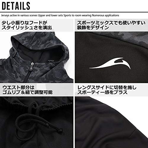上着のジップ部分は立体的な形状となっており、フード部分はあえて小さめにしていることで見た目の野暮ったさを少なくしてすっきりとしています。パンツのウエスト部分は紐で調整できるようになっているので、サイズ感もちょうどよく調整して履けます。上着にはかっこいいカモ柄・迷彩デザインも採用されていておしゃれです。ジャケット&パンツカラーは、カモフラージュカーキ×ブラック・迷彩ホワイト×ブラック・カモフラージュグレー×ブラックの3色より選べます。