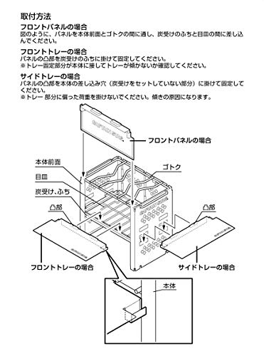 非常に簡単に組み立てられますよ。本体をコの字に広げてロストルをセットし五徳をセットするだけです。収納時はコンパクトでケースも付属しています。最新バージョンではロストルの高さを三段階に変えられるようになっていて料理や焚き火もしやすいですよ。またオプションも充実していて薪置場になったりトングなどを置く場所として使えるステンレストレーなどを取り付けられます。寸法はB6サイズの200×125×高さ180mmです。