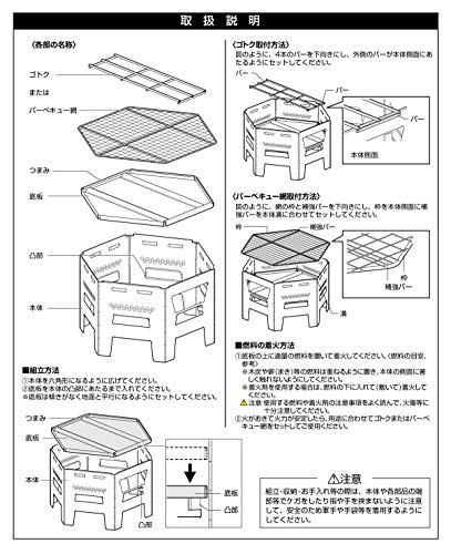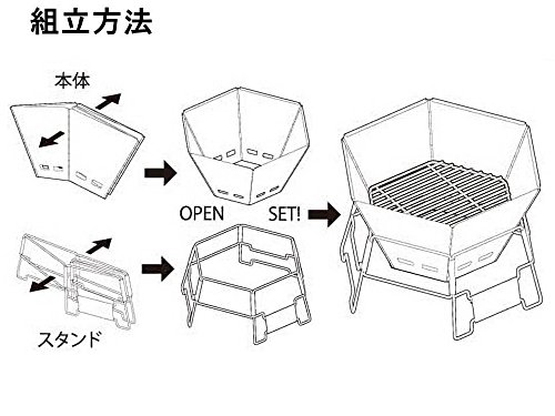 組み立て方はヘキサ型になっていても非常に簡単です。脚部を広げて本体をセットし、底(ロストル)、網の順で入れていくだけです。バーベキューをせず、焚き火を楽しみたいという方は、網はセットしなくても大丈夫です。コンパクトですが、複数人でも使える寸法になっていてソロバーベキュー、デュオバーベキュー、焚き火と多彩な使い方ができます。しかし、五徳はなく、ダッチオーブンのような重たいものは網が耐えられず調理はできません。