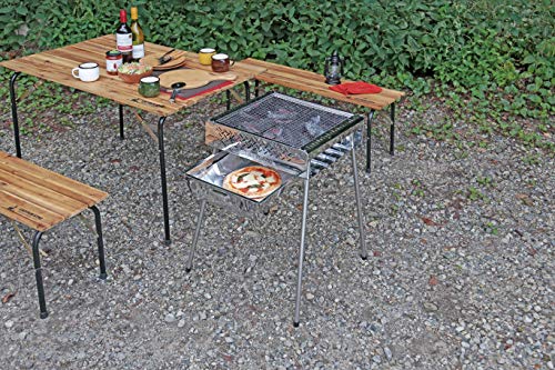 小型のダッチオーブンも置けるV型の焚き火台兼用バーベキューグリル、コンロです。大きさは350×260×高さ280mmになり2人でも使えます。また、しっかりした五徳が付属しダッチオーブン、スキレット、クッカーと多彩な調理方法に対応していて、幅を活かし右は焚き火、左は料理と使い分けることも可能です。多彩な使い方ができ、小型サイズと同じように専用のロックフレームによりしっかり固定する仕組みで使い勝手が抜群にいいです。