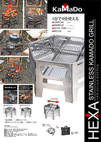 ファミリーキャンプでも使いやすいヘキサ型のカマドグリルとして発売された新作の商品です。大きさは450×390×高さ260mmとなり3~4人で使いやすい大きさになります。カマド型のため網を使用しているときでも小さな薪なら側面から入れられて非常に便利です。また、前述したV型のグリルに付いていた五徳のように移動させると簡単に薪が継ぎ足せて非常に扱いやすく、焚き火、バーベキュー、ダッチオーブンでの調理ができ使い勝手いいですよ。