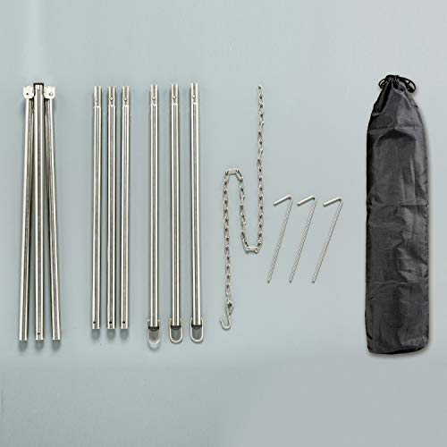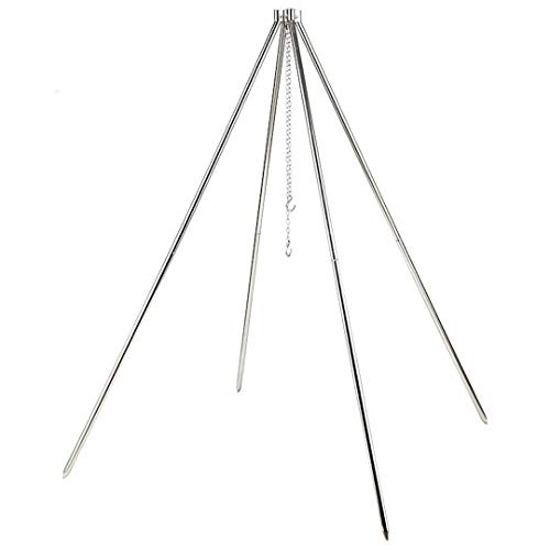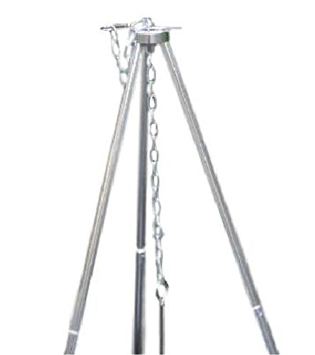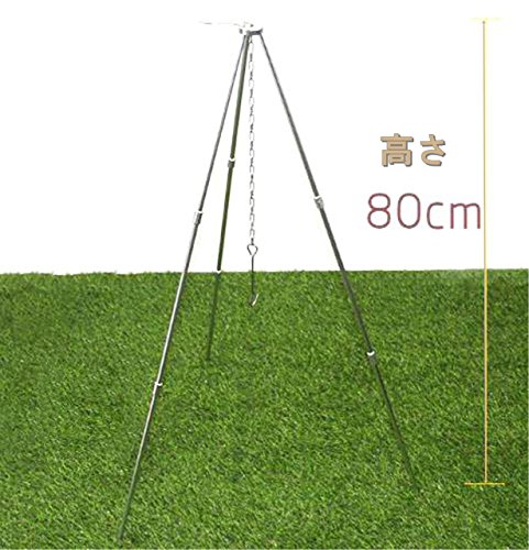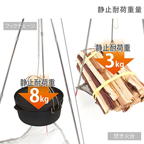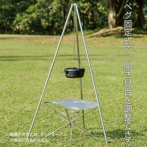 長さ調節可能なチェーンを採用しているので、焚き火台の火が丁度よく当たるように距離を調整できます。ペグ固定式なので、開き具合も調節できるトライポッドです。ステンレス製の頑丈な作りで、三脚で安定感良く設置することができます。耐荷重は30kgまでと頑丈なので、重さのあるダッチオーブンも安心して取り付けられます。
