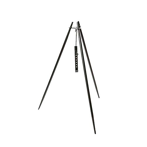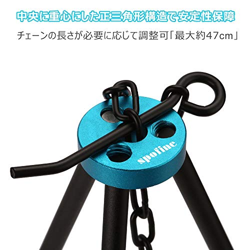 焚き火三脚のポールとアルミ合金製の接続ヘッドを装備していて、表面にサンドブラストと陽極酸化処理加工を施していることにより耐摩耗性に優れた頑丈な造りとなっている人気トライポッドです。中央部を中心としている正三角形構造で差し込みやすい尖った先端を採用しているので、安定感良く設置することができます。耐荷重は約5kgまでなので、小さなミニ鍋を吊り下げて調理するのにおすすめです。接続ヘッドのピンにより鉄製のチェーンの長さを調整できますので、吊るす鍋やダッチオーブンと地面までの高さも簡単に調整できます。
