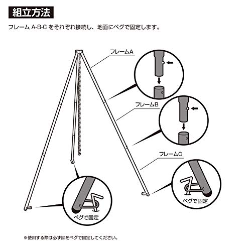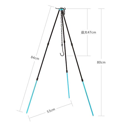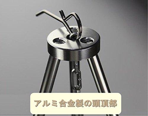 上部に付いているピンでチェーンの長さを自由に変えられますので、キャンプ用ダッチオーブン・ケトルの大きさや火力に合わせて使えます。使わない時はそれぞれのパーツをばらしてコンパクトにできる商品で、持ち運びも簡単にできます。組み立てもそれぞれのパーツをつなぎ合わせるだけという簡単な構造です。中央部に焚き火台を設置して、キャンプで料理を作るためのダッチオーブンやお湯を沸かすためのキャンプ用ケトルを吊るして使えます。全体の重さも470Gと軽量なトライポッドで、折りたたみ収納した後に入れられる専用収納袋も付いていますので、アウトドアで携帯する事も簡単な人気商品です。