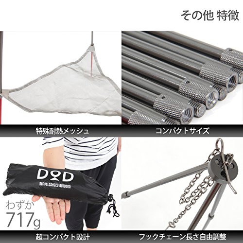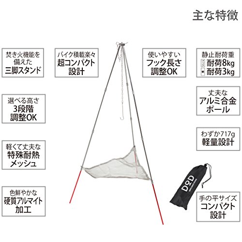 人気アウトドアブランド・DODのライダーズファイアクレードルは、通販サイトでも非常に売れ筋の人気トライポッドです。軽量で耐久性もあるアルミ素材のポールを採用し、頑丈なメッシュ焚き火網も一緒に付いてくる商品です。