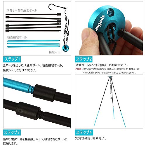 軽量で耐久性に優れているアルマイト加工済みのアルミニウム合金で作られているトライポッドです。中央部に焚き火台を設置して、チェーンに5kg未満の焚き火缶や鍋を吊るして料理を作れます。三脚で安定感よく設置できる頑丈なトライポッドで、ガスランタンを吊るすランタンハンガーとしての使い方もできます。アルミ製の9本の棒を、ねじ込んで組み立てるだけという簡単な構造なので扱いやすさはバツグン。チェーンはステンレス製で、ストッパーを利用することにより長さを変えられますので、火と鍋の距離を調整する事も可能です。