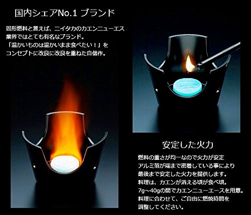 ニイタカの固形燃料は、小さい10gサイズなら13~18分前後、中間の25gは18~25分、大型の40gなら19~26分の燃焼時間です。これは着火しやすい上に燃焼効率がよく、悪臭がしないので部屋での鍋料理、ライスクッカーの炊飯や料理にももってこい。コッヘルの料理なら1個あれば支障はなく、アルミ箔が付いているので片付けも簡単と評判です。