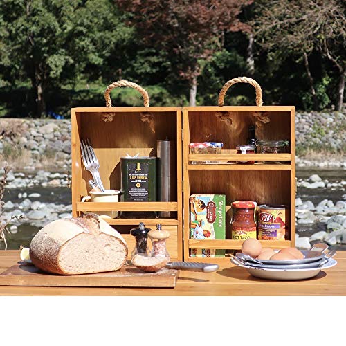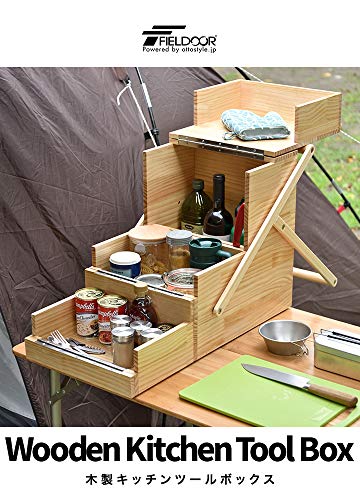 次はFIELDOORのおしゃれな木製ボックスです。布製のものよりは重くなりますが、やはり木製のアイテムなのでおしゃれですしキャンプにもぴったり。手軽さよりもおしゃれを重視したいという方におすすめな調味料ボックスです。