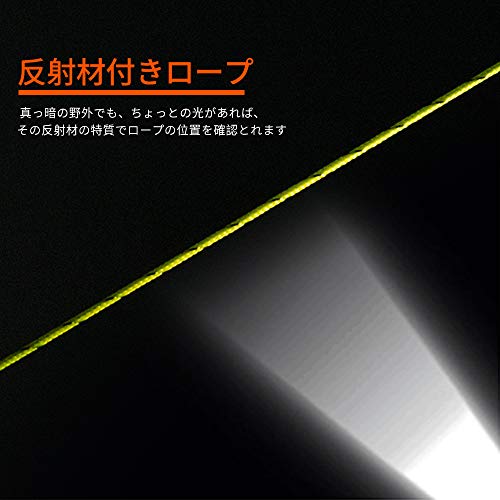 反射材も含まれていることにより、暗闇の中でもうっすらと光っていて足を引っ掛けてしまう事も防止できます。アルミニウム合金製の自在金具も付いていますので、テントをつける時にロープの長さやテンションを調節することもできて便利です。