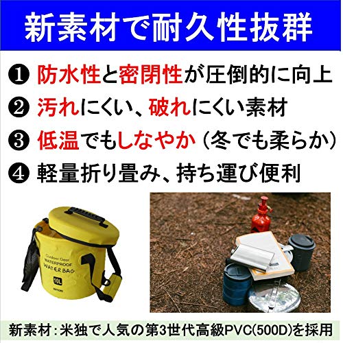 プレミアム500デニールターポリンを素材として採用し作られている丈夫な折りたたみ式バケツで、防水仕様なので中に水を入れてアウトドアで使った食器を洗うのにも便利です。シンク代わりとしてだけでなく、お湯を中に注いで汚れた衣類などを洗濯するのにも役立てられます。しっかりと自立させる事ができる商品なので、床にも安定感良く設置できます。お値段もとてもリーズナブルで、口コミでも評判良いおしゃれな折りたたみ式バケツです。