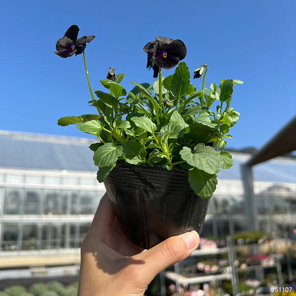 黒いビオラは珍しいため人気が高く、フラワーショップを何軒もはしごしてやっと手に入れる方もおられます。ペニーブラックは花芯の黄色以外はオールブラックで、特に大人の女性に好まれるシックな色です。ガーデニングにおいてはアリッサムなど白い小花との相性がよく、寄せ植えにも向きます。