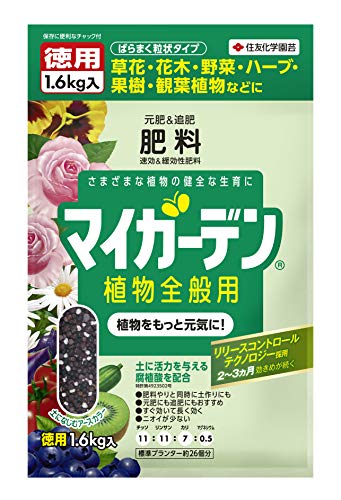 住友化学園芸の粒状タイプの速攻&緩効性肥料です。土に活力を与える腐植酸が配合されています。リリースコントロールテクノロジーを採用しているため、2-3ヶ月効き目があります。地植えでは1㎡あたり100g、プランターには1Lの用土に対して5ℊ混ぜてください。元肥&追肥に使えます。