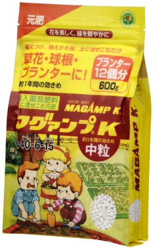 ハイポネックスの土に混ぜて使う緩効肥料です。中粒の大きさで手軽で簡単です。成分に、40%の溶性りん酸がたっぷり入っています。内水溶性りん酸は5%。プランター12個分の植え付けに最適な600g入りです。庭の土やプランターの土に混ぜ込むだけの元肥です。