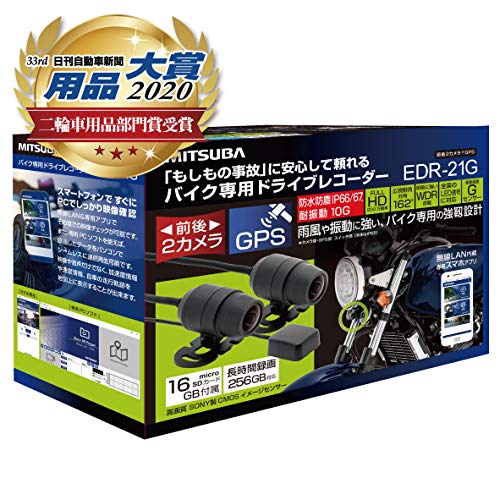 ミツバサンコーワのEDR-21Gは国内正規販売の信頼性がおすすめのバイク用ドライブレコーダーです。本体にディスプレイはありませんが、WiFi接続、GPS、フルHD1080Pの画質など、バイク用としてはフルスペック!価格以上の性能を期待したユーザーからの評価は低いものの、全体的な評判は高いですね。衝撃を受けたときや手動録画での録画時間は15秒です。