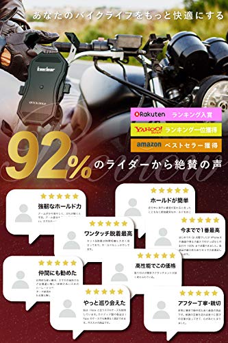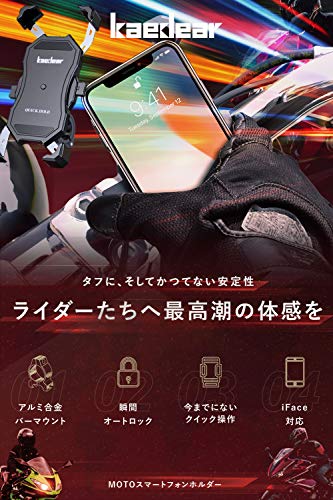 Kaedearというブランドメーカーのこちらのバイク用スマートフォンホルダーは、精密に設計されたホルダーの開閉機構やセーフティバンドの2重固定により、バイク走行中にも落下しないようにガッチリとスマホを固定できます。付属品も充実していてなおかつ高機能なので、コスパが高いバイク用スマホホルダーを手に入れたいと考える方にもオススメな商品です。