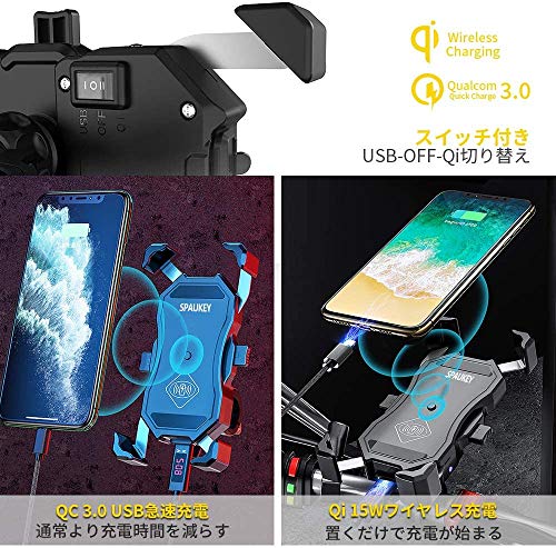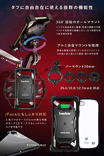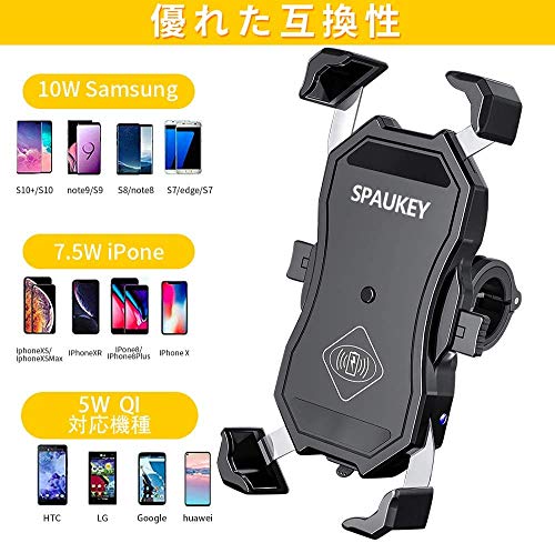 丈夫な作りの開閉アームや内側部分のシリコンゴムによってスマートフォンをを傷つけないようにしっかりと固定できます。ボタン押せばアームが開くようになっているので、スマホ着脱も簡単です。Qi15Wワイヤレス充電機能が付いている商品になりますので、IPhone11・iPhone11Pro・iPhone11ProMaxなどの機種をセットするだけで充電することも可能です。IPX6の防水仕様なので、水分にも耐性を持っているスマホホルダーなので天候が悪い日のバイクでの移動中にも問題なく使える商品です。