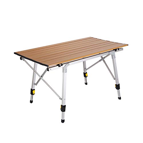大きいサイズのアルミ製テーブルの天板にはメラミン加工が施されているため、耐熱性・防汚性に優れています。150℃までの耐熱性を備えているので、熱した鍋を載せる事もできます。さらにテーブルは高さを2段階まで調整できるので、シーンに合わせて設定して便利に使えます。足を取り付けるだけでセッティングが完了するシンプルな構造で、使っていない時は二つに折り畳みしてコンパクトにできるので持ち運びも非常に簡単です。