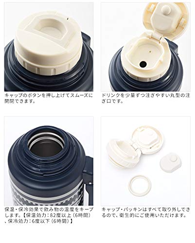 サイドには強度に優れた丈夫な持ち手が付いているので、蓋のカップにも飲み物を注ぎやすいです。キャップのボタンを押し上げてスムーズに開閉することができ、開口部はドリンクを少量ずつ注ぐこともできる丸型です。保温ドリンク・保冷ドリンクの両対応で、季節関係なく便利に活用できる点も魅力です。使い終わったらキャップとパッキンを全て取り外して洗えるので、気温の高い夏場も衛生的に活用していてます。マスタードとネイビーの2色展開で、安い値段で手に入れられるので人気があります。
