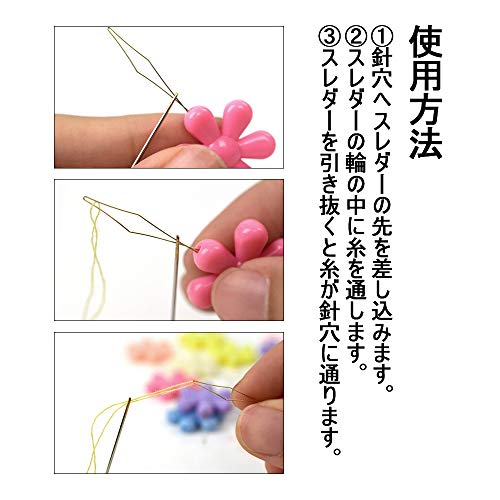 こちらの便利アイテムは一般的なものと同じですが、持ち手がカラフルなお花のデザインで女性に人気の高いアイテムです。ひし形の針金部分が少し大きくて見えやすい反面、細い針穴には不向きなので太めの針に使いましょう。使い方は、針穴にのひし形部分をさし、通したひし形部分の中に糸をくぐらせ針穴から抜きます。そうすると針穴に糸が通っているという仕組み。可愛らしいアイテムを使うと気持ちもより華やかになります。