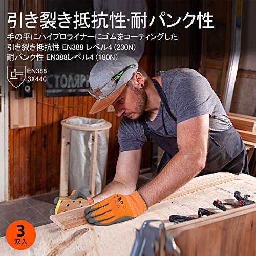 耐切創機能が付いているハイプロ繊維を。手のひらには通気性に優れている発泡ゴムをコーティングしているため、柔らかさを感じることができてかつ滑り止め効果も発揮してくれます。伸縮性の高いニットの袖口を採用しているため、手首へのフィット感も抜群な軍手で、しっかりとフィットしてくれることで作業中に手袋の中に埃なども入りにくいです。アウトドアでのお仕事やご自宅でのDIYなど様々な場面で活躍してくれるでしょう。