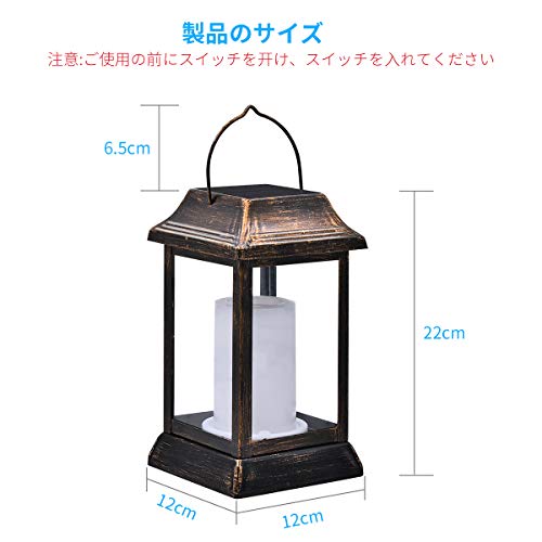 かがり火のような雰囲気をもつライトです。炎をイメージした光が本品の特徴になりますが、明るさ自体はおよそ4ルーメンほどしかありません。また、暖色で適度に揺らいでいるため雰囲気重視のためのソーラーライトとなり防犯、作業用には適さないタイプです。パーツの塗装なども非常に細かく作られてアンティーク調の美しいランタンのため庭や玄関先、店先など場所を選ばず使いやすく、スタンドなどは別途必要ですが、置いても吊るしても使えます。