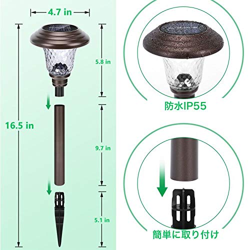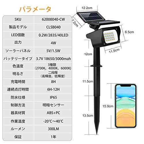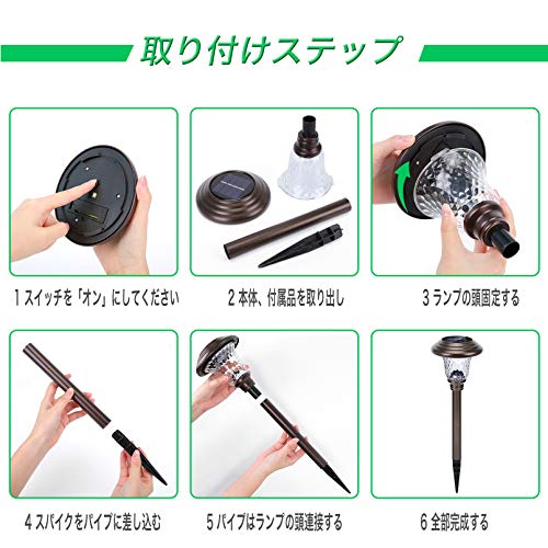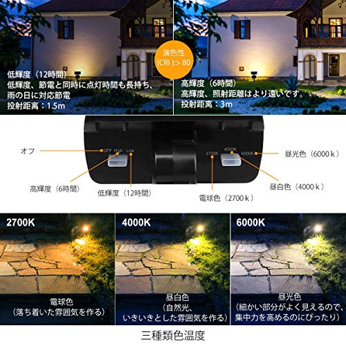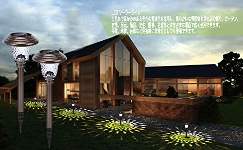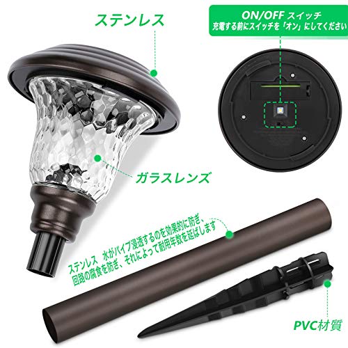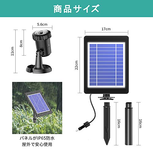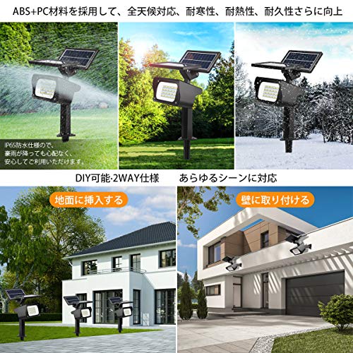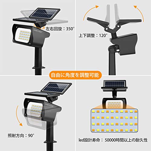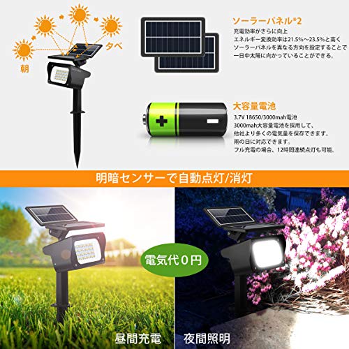 いろいろモードがあり、非常に明るいためガーデニングの演出から防犯に使えるタイプです。大きなソーラーパネルが2枚付いているため一体型と比べ発電効率が非常に高い出力で照らせます。4本セット、2本セットがコスパがいいと評価されていて、最大2年間の保証もあり安心して使えます。