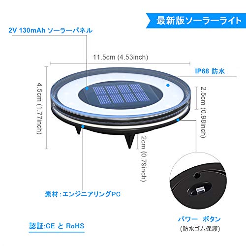 珍しい埋め込み式のライトで白色の他に青などの色があります。クールホワイトのように青みのかかった白ではなく正真正銘の青となりクールでかっこいい空間を演出できますよ。薄型タイプで完全に地面に埋め込みできます。しっかり太陽に当たる場所なら最大で10時間ほど点灯してくれますよ。真夜中以外はきちんと照らし、完全防水となるIP68のため大雨や暴風雨でも浸水することなく安心して使えるでしょう。耐荷重は20トンまでとなり頑丈です。