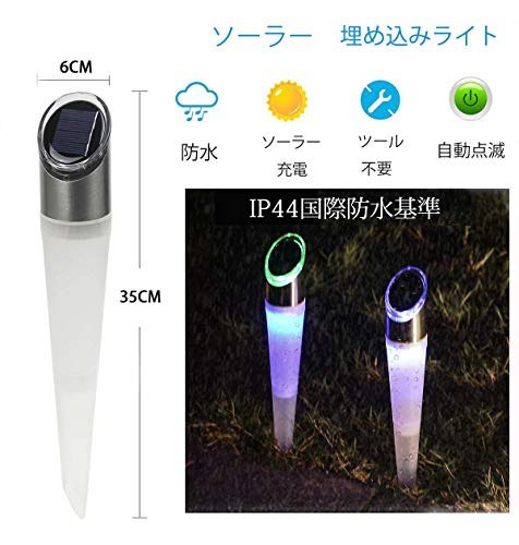 カラフルでデザイン性の高いソーラーライトです。杭の部分もライトになっていて、近未来感のあるユニークなデザインが特徴になります。白色の他にレインボカラーの多彩な色合いに変化していきます。一体型のため日当たりのいい場所にしか設置できませんが配線不要で使いやすいと評判ですよ。特殊な形状ですがきちんと防水機能もありIP44のため暴風雨以外なら問題ないでしょう。埋め込み式のため手軽に設置できます。