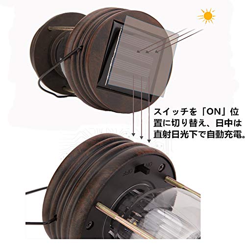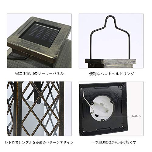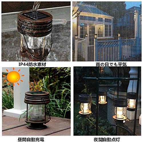 アンティークなソーラーライトです。大きさはスマホと変わらない程度ですが幻想的な暖色でしっかり照らしてくれますよ。上部に太陽電池がある一体型のため影になる場所では使えませんが、自動点灯でソーラーライトとして使いやすい部類になります。暖色のため雰囲気重視のライトとなり、大きな木に吊ったり門柱に置いたりするだけで雰囲気がよくなりおすすめです。価格も安いと評価されていてしっかり防水機能があるIP44で雨でも安心です。