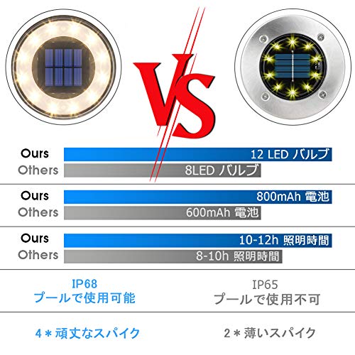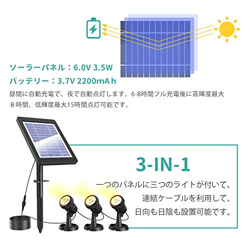 非常に明るいライトのため、しっかり照らしてくれて太陽電池と本体が離れているためレイアウトしやすいと評価されています。ライト部分はIP68となり水につけても、ライトアップできます。さらにパネル部分もIP65となり非常に雨に強いです。他のライトと比べると光量がありますがウォームホワイトのため眩しさはなく雰囲気も壊しませんよ。