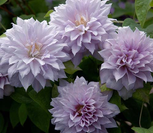 八重咲きのとてもゴージャスなクレマチスで比較的早い時期から咲き始める大輪の種類がこの花。名前が少し日本人には読みづらくベルオブウォーキング・ベルオブウォッキングなどと少し違う名前で出回っていることもあります。最初に付く花が一重であとから咲くものが八重になることもある面白い咲き方をする種類。色は淡い紫がかったピンク色が個性的です。