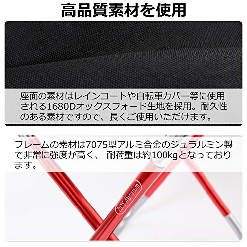 出典: https://www.amazon.co.jp/%E3%82%A2%E3%82%A6%E3%83%88%E3%83%89%E3%82%A2%E3%83%81%E3%82%A7%E3%82%A2-%E6%8A%98%E3%82%8A%E3%81%9F%E3%81%9F%E3%81%BF%E5%BC%8F%E3%81%AE-%E3%82%AD%E3%83%A3%E3%83%B3%E3%83%97%E3%83%81%E3%82%A7%E3%82%A2-%E8%B6%85%E8%BB%BD%E9%87%8F%E3%81%AA%E3%81%AE%E3%81%AB%E8%80%90%E8%8D%B7%E9%87%8D%EF%BC%91%EF%BC%90%EF%BC%90kg%E3%81%AE%E4%B8%87%E8%83%BD%E3%82%A2%E3%82%A4%E3%83%86%E3%83%A0-%E3%82%AD%E3%83%A3%E3%83%B3%E3%83%97%E3%81%84%E3%81%99%E6%8A%98%E3%82%8A%E3%81%9F%E3%81%9F%E3%81%BF%E3%82%B3%E3%83%B3%E3%83%91%E3%82%AF%E3%83%88/dp/B08F791S8X/ref=sr_1_18?__mk_ja_JP=%E3%82%AB%E3%82%BF%E3%82%AB%E3%83%8A&dchild=1&keywords=%E3%82%AD%E3%83%A3%E3%83%B3%E3%83%97+%E3%82%A2%E3%82%A4%E3%83%86%E3%83%A0&qid=1608800463&s=sports&sr=1-18自転車カバーやレインコートにも使われている1680デニールオックスフォード生地を座面に採用し、フレームには7075型アルミ合金のジュラルミンを採用していますので耐荷重が100kgまでと堅牢で、しっかりと体重を乗せて腰を落ち着けられます。