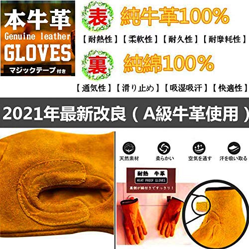 MinistoreDirectというブランドメーカーの火に強い耐熱性に優れた牛革製グローブになります。耐熱性だけでなく柔軟性や耐久性や耐摩耗性に優れている純牛革を表地に100%採用し、裏側には通気性や吸湿吸汗性や滑り止め効果もある純綿100%を使用しています。