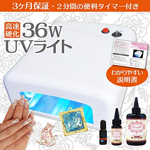 ジェルネイルにもレジンにも使える蛍光灯タイプの36Wタイプです。非常にコスパが優れている製品で4本UVランプを使用し、きちんと反射するように作られていてまんべんなく紫外線をアクセサリーに照射でき、トレーが引き出せるようになっていますが、他のブランドと比較すると9W並に安いです。また、2分タイマーもあり小さいものを作るときや、きっちり時間を計りながら作品を作りたいというときにも使いやすくなっていますよ。